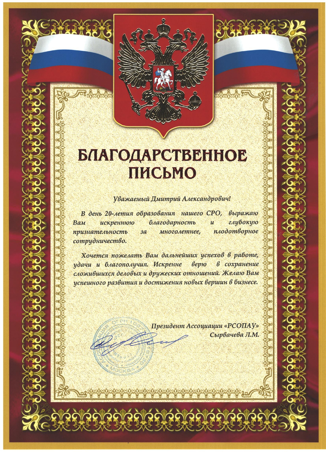 Качество работы сотрудников подтверждают отзывы партнеров и коллег. На днях президент Ассоциации «РСОПАУ» вручил генеральному директору НЦБ благодарственное письмо, отметив плодотворное многолетнее сотрудничество саморегулируемой организации арбитражных управляющих и Национального центра банкротств.